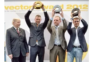 Ganadores de terceros premios vectoriales (de izquierda a derecha): El ganador del oro Michael Büchel (KUKA Systems GmbH, Alemania), Joury van Gijseghem (DEME, Bélgica) y Fabio Ferri (SCM Group, Italia) con Günter Blase (igus®).