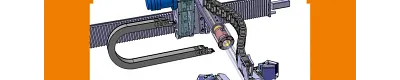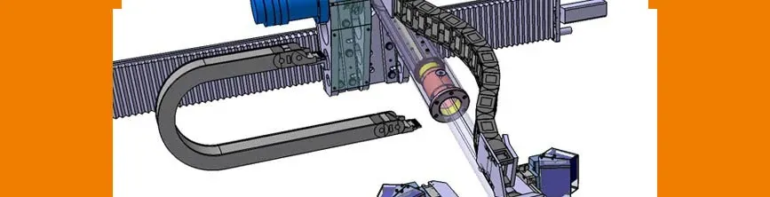 de soldadura por fricción Para esta aplicación, las partes del motor de la aeronave se sueldan juntas. Los puntos de soldadura se miden de antemano. Los sensores están ubicados en una unidad telescópica. Aquí se utiliza una solución extraordinaria de igus® para el suministro de energía y hace posible esta aplicación en primer lugar. Se utilizaron eslabones de cadena estándar para construir un portacables de cadena de energía especial que es capaz de doblarse en una dirección diferente en el medio que al principio y al final. Esto se hizo necesario debido a que no se permite que el portacables de la cadena de energía se proyecte más allá de la unidad telescópica.