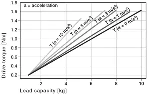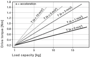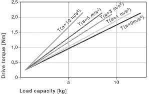* Suposición: La masa móvil se ubica en un círculo circunscrito con un máximo. R = 100 mm a la mitad del carril de guía, par máximo permisible versión 01:1.3 Nm, a= 0 m/s²; Versión estándar: 2.4 Nm, a= 0 m/s²;