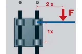 Cuando se utilizan guías lineales drylin®, es importante asegurarse de que las fuerzas actuantes sigan la Regla 2:1 (ver dibujo, derecha). Si la carga o la fuerza motriz (F) es mayor que el doble de la longitud del rodamiento (1x), puede producirse un movimiento de unión o interrupción.