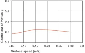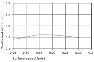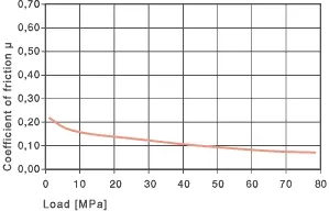 El coeficiente de fricción depende de la capacidad de tensión del rodamiento. Cuando los valores p x v exceden el rango permitido, los cojinetes responden con un aumento en el coeficiente de fricción. Siempre y cuando las cargas estén en el rango permitido, el coeficiente de fricción del rodamiento es muy bajo. Además, los coeficientes de fricción de iglide® V400 son muy constantes. Ningún otro material de rodamiento iglide® exhibe una menor variación en los coeficientes de fricción, incluso cuando el material del