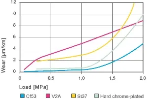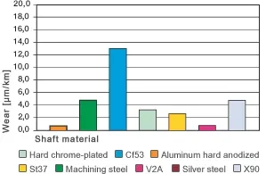 Como se menciona en la sección sobre fricción y desgaste, los rodamientos iglide® V400 muestran solo una dependencia muy baja de los materiales del eje con respecto a la fricción de los sistemas de rodamientos. Esto se aplica incluso cuando se prueban ejes de plástico y cerámica además de los de acero. Mayor es la influencia en la resistencia al desgaste. Aquí ya a bajas cargas (0.75 MPa) podría haber variaciones significativas, como muestra la Figura 20.7