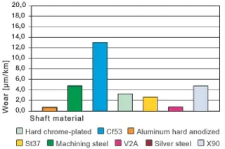 Fig. 2.7: Desgaste, aplicación giratoria con diferentes materiales de eje, carga p = 0.75 MPa, v = 0.5 m/s