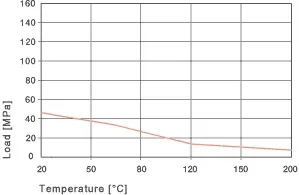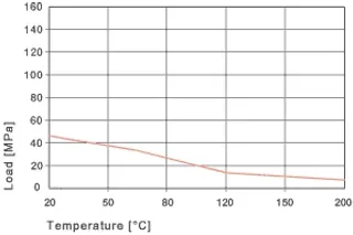 La temperatura máxima de aplicación permitida a largo plazo es de 200° C, sin embargo, los cojinetes deben estar asegurados mecánicamente a estas temperaturas. Pero la resistencia al desgaste del rodamiento es excelente y reclama una posición superior entre todos los materiales iglide®. Con el aumento de las temperaturas, la resistencia a la compresión de los cojinetes iglide® V400 disminuye. La Fig. 20.3 aclara esta conexión