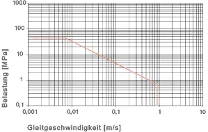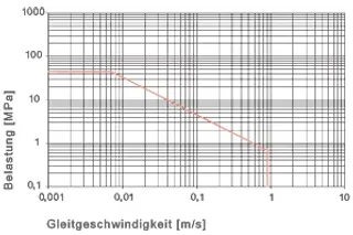 Los rodamientos iglide® V400 de presiónsuperficial no son adecuados para altas presiones o cargas estáticas elevadas. Sin embargo, se caracterizan por una alta resistencia al desgaste hasta la presión superficial máxima recomendada. Además el límite de las cargas permitidas a 100° C es aún mayor con 20 MPa. La alta elasticidad se ve también en la curva que establece la deformación bajo las cargas permitidas.